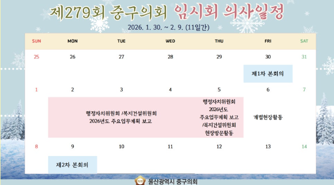 울산 중구의회, 2026년 97일간 회기 일정 확정